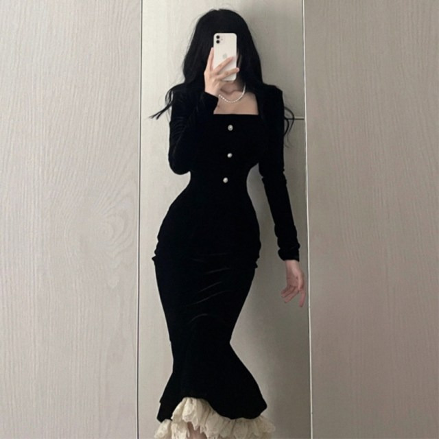 피어니스트 딥블랙 벨벳 스퀘어넥 슬림 원피스,